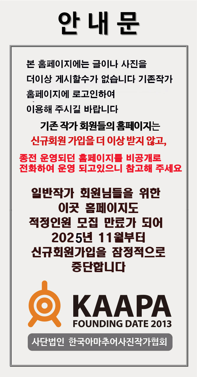 KAAPA는 전국 아마추어 사진가의 창작과 예술활동을 돕기 위해 출사 스튜디오 모델 전시회 교육 등을 지원합니다.